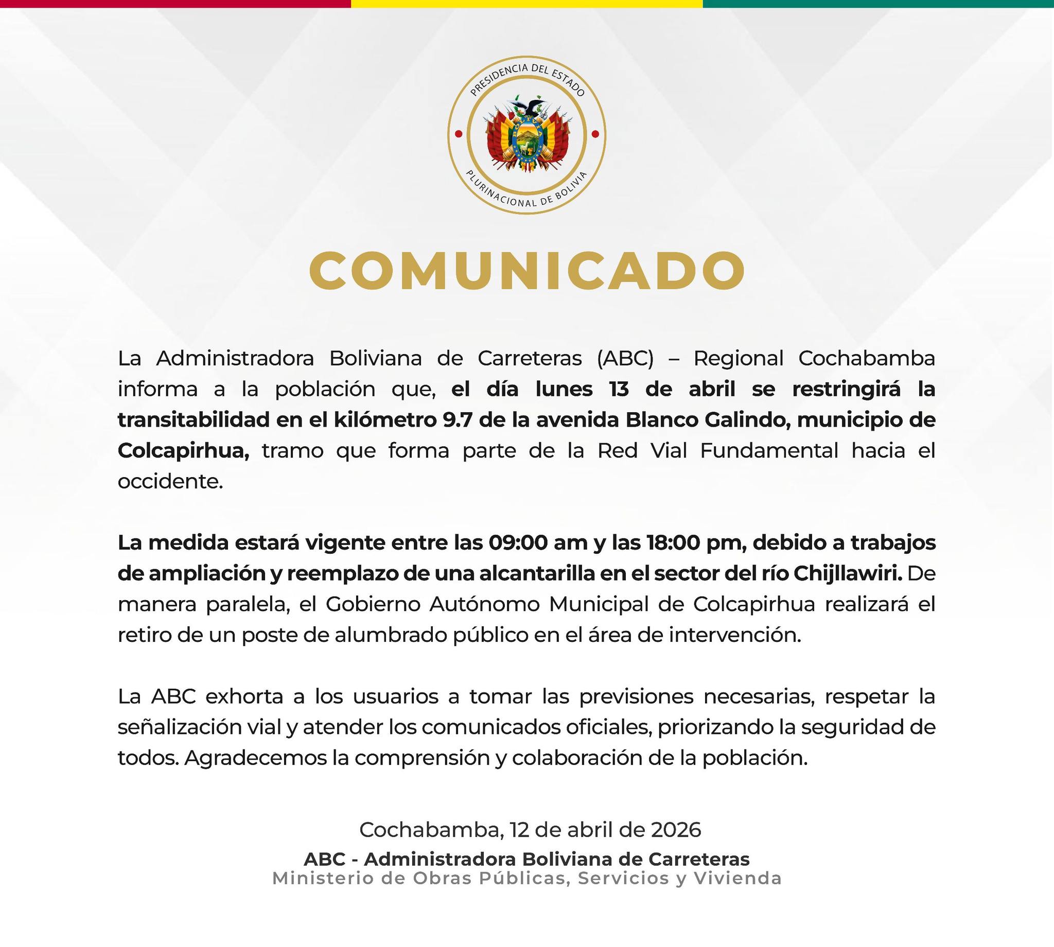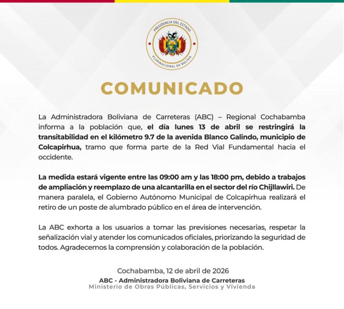 Cochabamba, 12 de abr 2026 (En Conexión).- La Administradora Boliviana de Carreteras (ABC) informó sobre la restricción de transitabilidad que se implementará este lunes 13 de abril en el kilómetro 9,7 de la avenida Blanco Galindo, en el municipio de Colcapirhua, vía que conecta con el occidente del país. De acuerdo con el comunicado oficial, la medida estará vigente desde las 09:00 hasta las 18:00.
