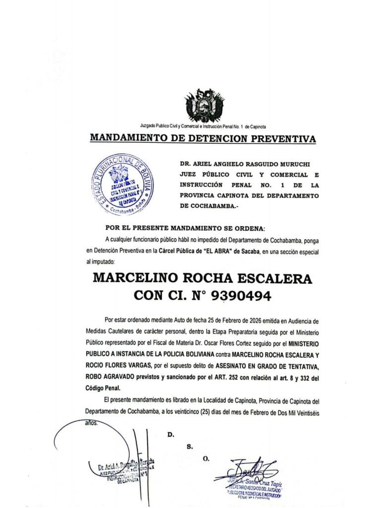 Se ha establecido un mandamiento de detención preventiva en la cárcel de El Abra contra Marcelino Rocha Escalera por el supuesto delito de asesinato en grado de tentativa y robo agravado. El mismo mandamiento procede contra Rocío Flores Vargas en la cárcel de San Sebastián mujeres.
