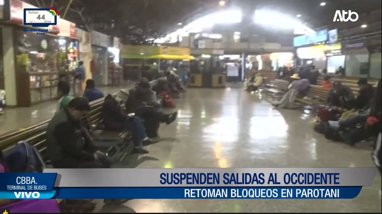 La Paz, 16 de abr 2026 (En Conexión).- Desde la terminal de buses de Cochabamba se reporta que las salidas al occidente están suspendidas por los bloqueos en el puente de Parotani, tampoco existen salidas por rutas alternas.