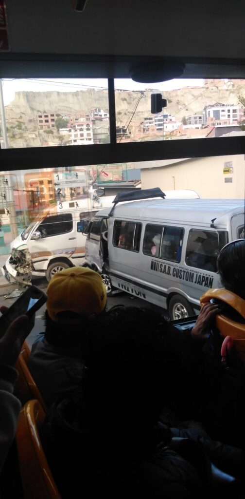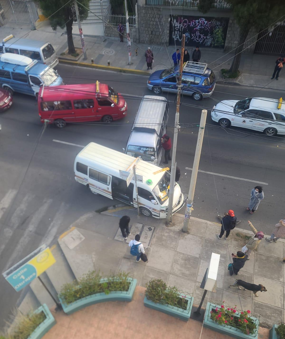 La Paz, 21 de abr 2026 (En Conexión).- Un accidente de tránsito entre dos minibuses se registró en la calle 1 de Obrajes, en la ciudad de La Paz.