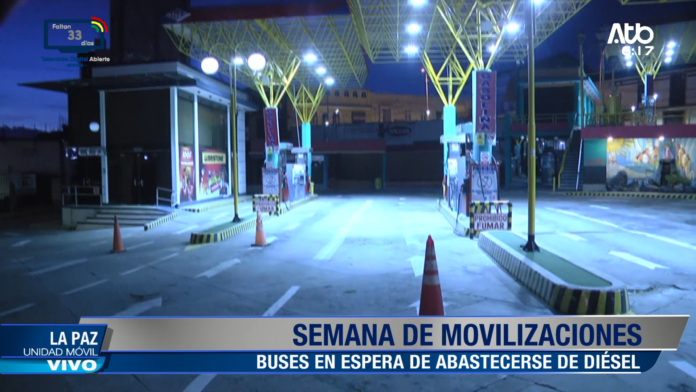 La Paz, 27 de abr 2026 (En Conexión).- En la estación de servicio El Volcán, en la ciudad de La Paz, se registran largas filas de buses, vehículos de carga pesada y automóviles particulares.