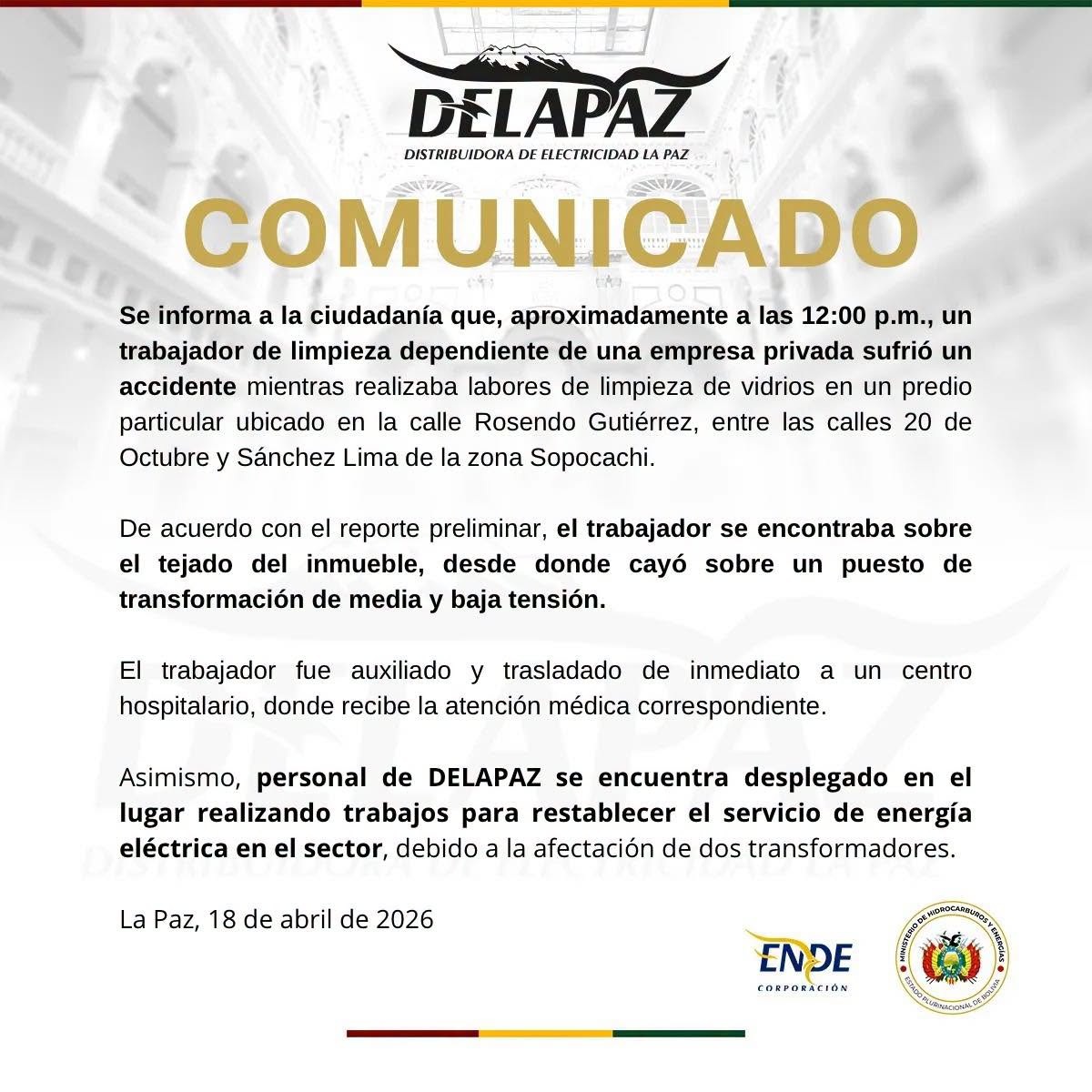La Paz, 18 de abril 2026 (En Conexión).- DELAPAZ informó que su personal se encuentra desplegado en la zona de Sopocachi, en la ciudad de La Paz, realizando trabajos para restablecer el servicio de energía eléctrica tras la caída de un trabajador de limpieza de una empresa privada.
