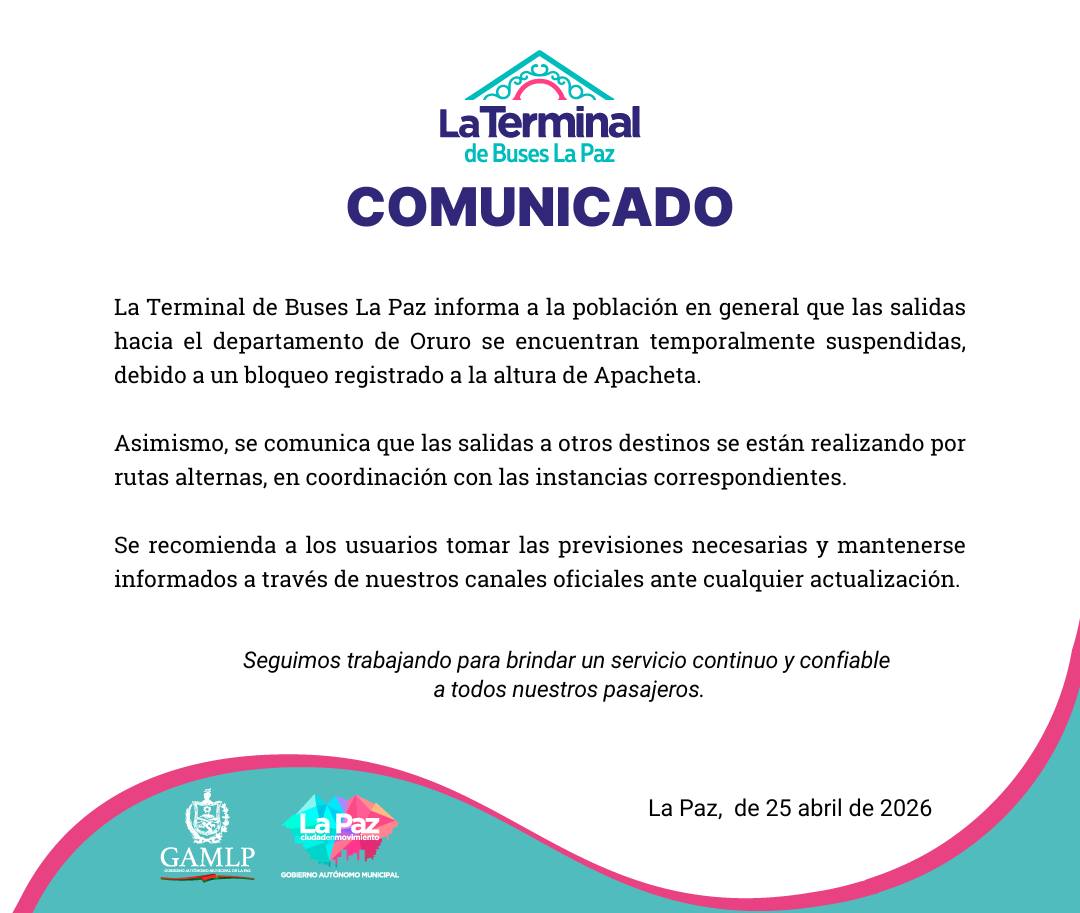 La Paz, 25 de abril 2026 (En Conexión).- La Terminal de Buses de La Paz informó, este 25 de abril, que las salidas hacia Oruro fueron suspendidas temporalmente debido a un bloqueo registrado a la altura de la Apacheta.