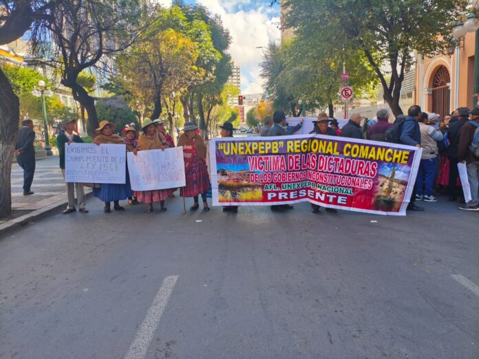La Paz, 13 de abr 2026 (En Conexión).- Integrantes de la organización UNEXPEPB regional Comanche, que agrupa a víctimas de dictaduras de gobiernos inconstitucionales, realizaron una protesta en el Ministerio de Justicia exigiendo el cumplimiento de la Ley 1568.