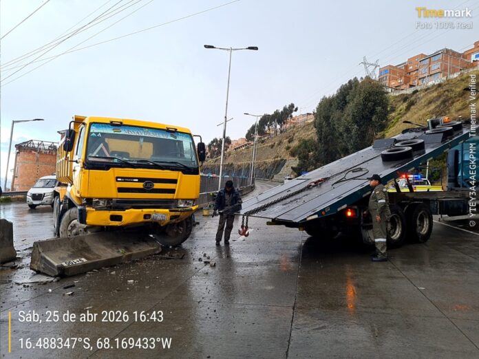 La Paz, 25 de abr 2026 (En Conexión).- La tarde de este 25 de abril se registró un hecho de tránsito en la autopista La Paz–El Alto, donde una volqueta amarilla perdió el control, impactó contra un minibús y posteriormente colisionó con el separador vial entre carriles.