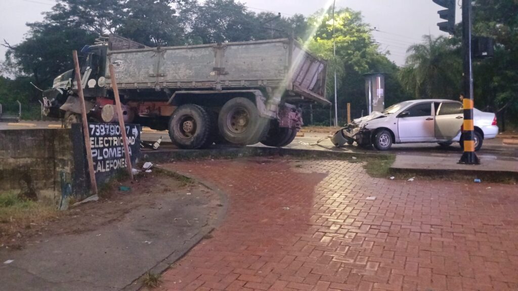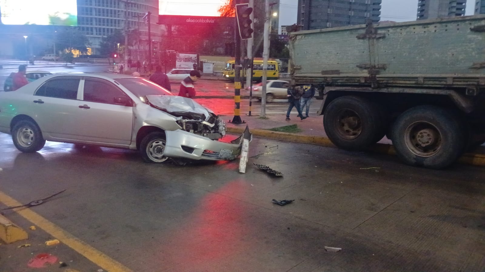Santa Cruz, 29 de abr 2026 (En Conexión).- Un aparatoso accidente de tránsito se registró esta tarde en la intersección de la Avenida San Martín y el Cuarto Anillo, involucrando a dos vehículos particulares y un tractocamión tipo volqueta. Según testigos, el impacto fue de gran magnitud, aunque preliminarmente solo se reportan daños materiales. El accidente sucedió en la madrugada de este miércoles 29 de abril.