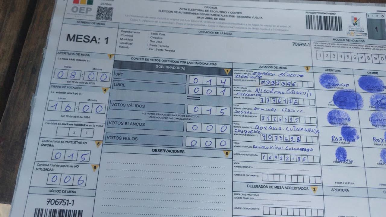 Según la información registrada en el documento, en esa mesa el resultado favorece a Santa Cruz Para Todos (SPT) con 14 votos frente a 1 voto obtenido por Libre, en la elección para la Gobernación de Santa Cruz.