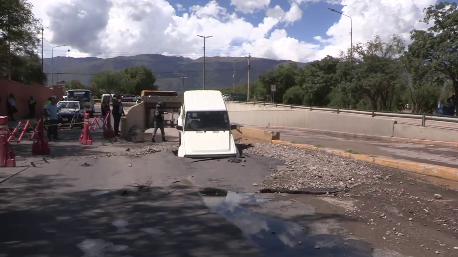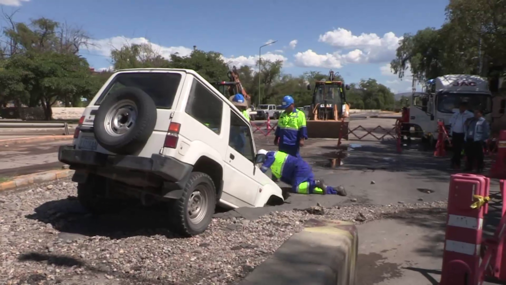 Cochabamba, 02 de mar 2026 (En Conexión).- Un vehículo se hundió en la plataforma de uno de los desniveles del Puente Quillacollo, un hueco se abrió por una fuga de agua en una de las aducciones de Semapa. Se informó que la causa fue una filtración de una tubería de aducción, lo que debilitó la estructura de la capa asfáltica. Personal técnico actualmente trabaja en la zona mientras se mantiene restringida la circulación. Según Víctor Fernández, Gerente Técnico de Semapa, la tubería tiene una antigüedad entre 20 a 30 años aproximadamente.