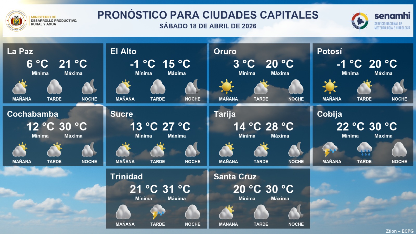 La Paz, 18 de abril 2026 (En Conexión).- El Servicio Nacional de Meteorología e Hidrología (Senamhi) difundió el pronóstico del clima para este sábado 18 de abril, con variaciones de temperatura y condiciones mixtas en las principales ciudades capitales del país.